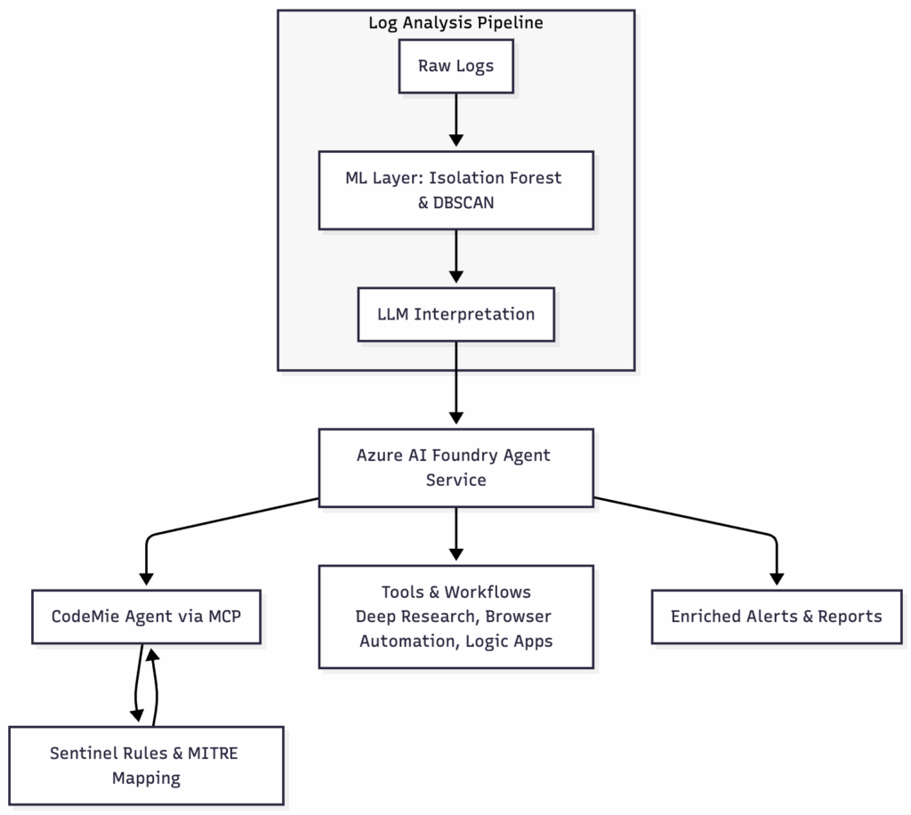 In our research, we focused on infrastructure‑level and cloud telemetry logs (data sources such as API calls, account logins and database connections), since these are fundamental to core operational and security functions. Other types of telemetry (application logs, endpoint logs, etc.) share similar patterns, but the principles remain applicable. We found that the major cloud providers (Microsoft, Google, Amazon) offer powerful analytics solutions, often with proprietary LLM‑enabled tools. We specifically looked at Microsoft’s Azure AI Foundry: a comprehensive AI/ML suite integrated with existing Azure services. Foundry includes modules for AI engineering (pipelines, experiments, deployments), model management and an agent service for orchestrating multi‑agent processes. It offers a unified portal for data preparation, model training, evaluation and deployment, enabling rapid development and scalable production.