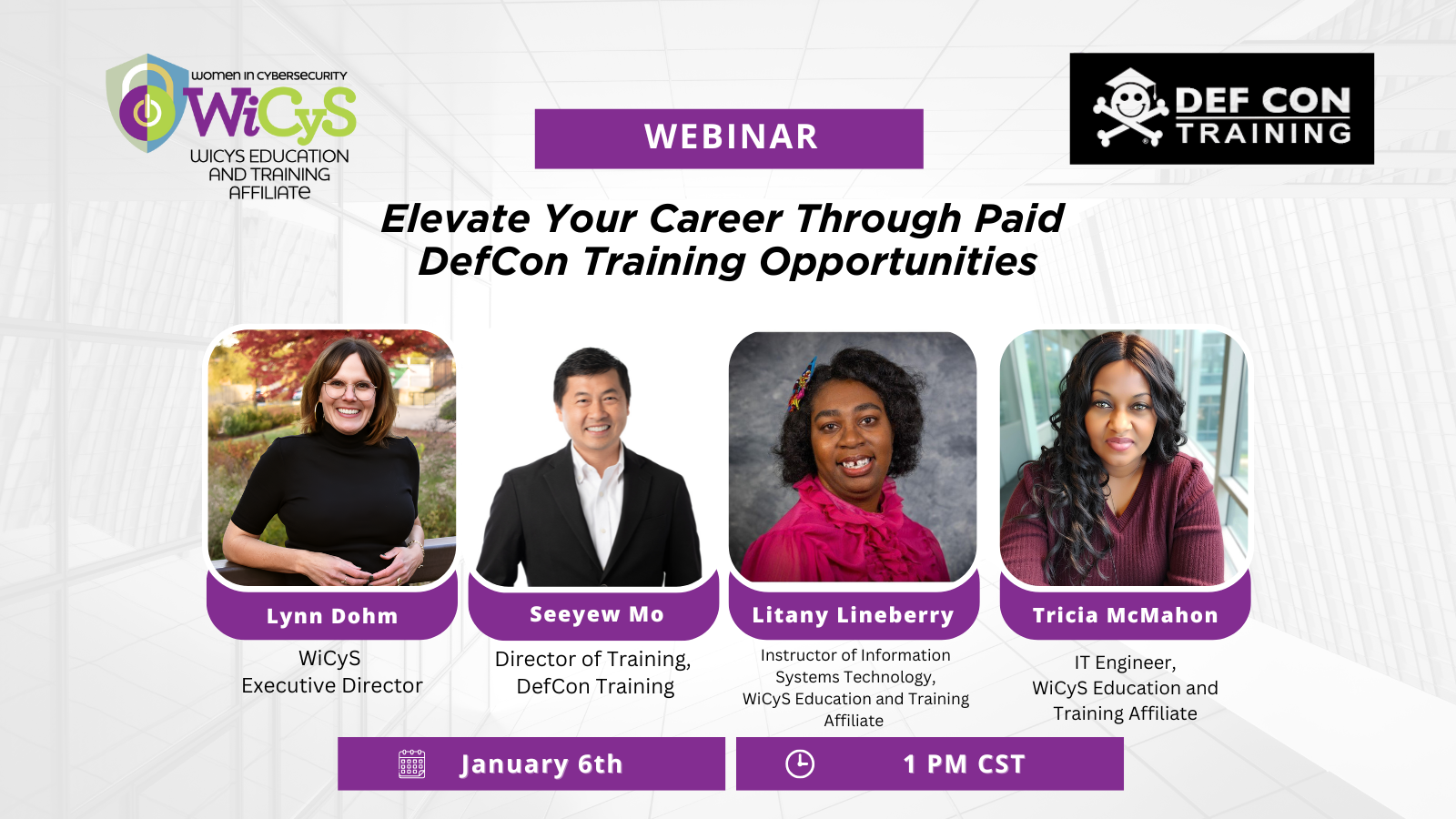 Join the WiCyS Educational and Training Affiliate for an informative webinar on how and why to facilitate a training at DefCon. Learn the career growth opportunities that on-site training can offer and how to best showcase your expertise to the DefCon community. This session will be joined by SeeYew Mo, Director of Training for DefCon training, and will equip attendees with the knowledge on how to develop this new skill, DefCon’s training pay structure, and the submission process. Lynn Dohm, WiCyS executive director, will moderate the session.