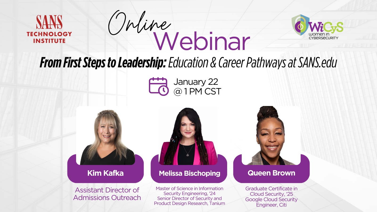 Join WiCyS and SANS Technology Institute for an informative webinar designed for women at every stage of their cybersecurity career, discussing how the SANS Technology Institute's degree and certificate programs turn potential into day-one impact and long-term growth. We’ll explore the journeys of alumnae from varied backgrounds who found opportunity, confidence, and career success through […]