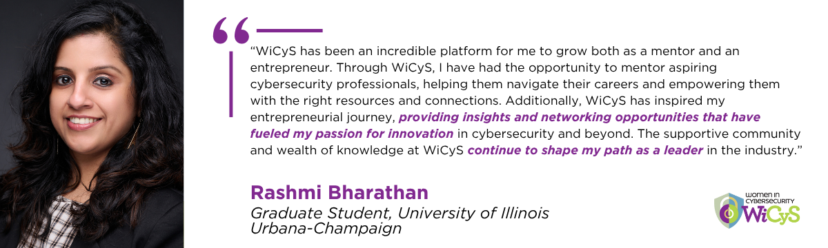 For Rashmi Bharathan, WiCyS is more than a professional network; it’s a catalyst for change. With over 13 years of IT experience across retail, pharmaceutical and finance industries, she has built a strong foundation in technology and leadership. Her career has included roles such as Dotcom Support Specialist, ITSM Specialist, IT Auditor, Configuration Audit Manager and Senior Analyst. Now, as an international MBA student at the University of Illinois Urbana-Champaign, Rashmi is combining her technical expertise with business strategy to prepare for her goal of becoming a product manager in cybersecurity.