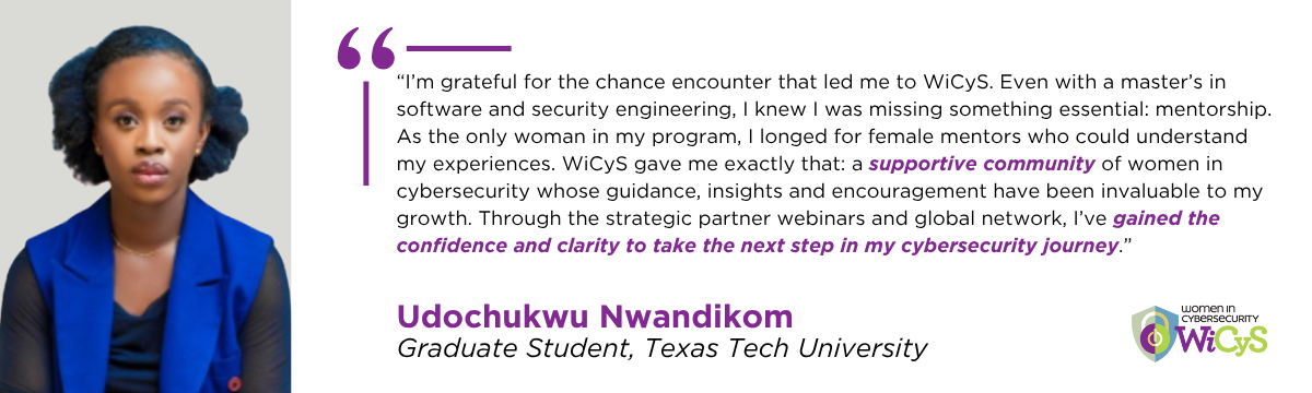 For Udochukwu, WiCyS has been more than a professional network; it’s been a turning point. From feeling uncertain about her path after graduate school to confidently shaping her future in cybersecurity, she has found clarity, confidence and community. And as she puts it, this is only the beginning of her WiCyS story.